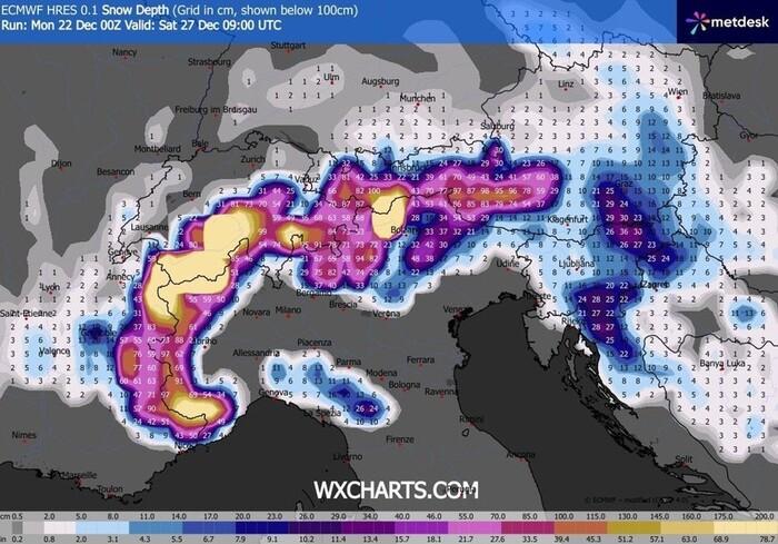 Queste condizioni come detto ci accompagneranno per tutta la settimana di Natale: per questo motivo sulle Alpi Occidentali è prevista una neve da record. Gli ultimi aggiornamenti confermano la possibilità di fenomeni nevosi addirittura per 5 giorni di fila in località come Prato Nevoso (CN), Limone Piemonte (CN), Sestriere (TO) e Courmayeur (AO). Entro la fine della settimana ci aspettiamo circa 2 metri di accumulo (ma potenzialmente anche di più) oltre i 1800/2000 metri su Piemonte e Valle d'Aosta; fino a 3 metri di neve fresca oltre i 2500 metri.