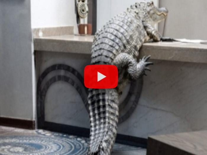 Un enorme coccodrillo del Nilo, lungo circa quattro metri, è emerso improvvisamente dalle acque del fiume Zambesi e si è introdotto all’interno dell’A’zambezi River Lodge, arrivando fino all’area del ristorante a buffet.