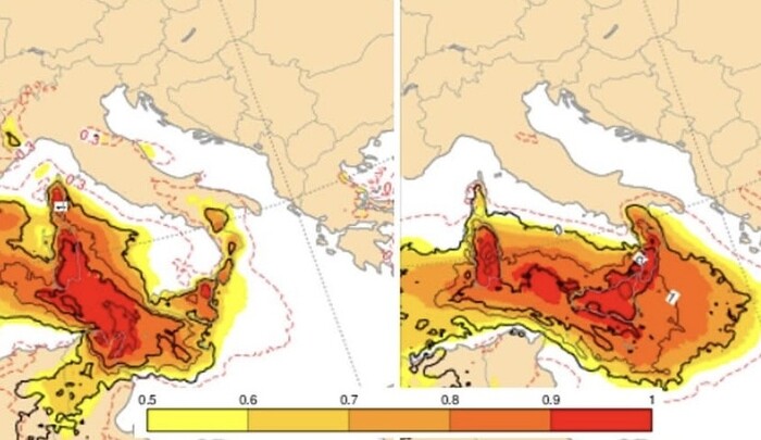 L’EFI (Extreme Forecast Index), indicatore che misura quanto un fenomeno meteorologico previsto si discosti dai valori climatologici medi calcolati dai modelli, evidenzia per la Sicilia valori particolarmente elevati, soprattutto lungo le coste ioniche e i mari adiacenti. Questo significa che non si tratta semplicemente di venti sostenuti o mare mosso, ma di una fase insolitamente intensa per il territorio siciliano, dove vento e mare potrebbero raggiungere livelli superiori rispetto a molti episodi simili registrati in passato.