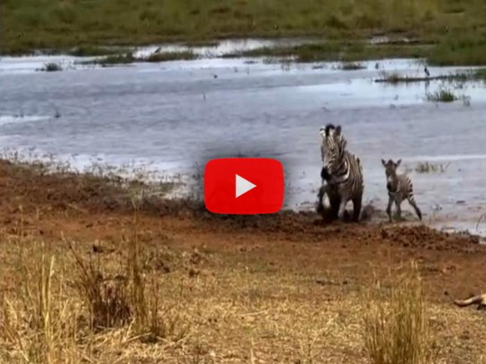 Il felino entra in acqua con movimenti rapidi e silenziosi, puntando una piccola zebra apparentemente indifesa. Ma l’attacco non va come previsto. La madre reagisce senza esitazione, si frappone tra il predatore e il cucciolo, colpisce e respinge il primo assalto, sorprendendo il leopardo.
