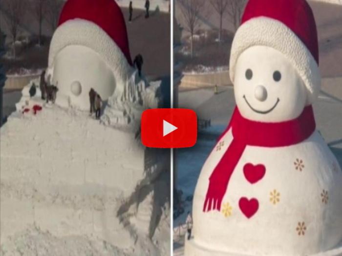 Un filmato in timelapse racconta tutte le fasi della realizzazione dell’opera: undici giorni di lavoro intenso durante i quali 64 scultori, affiancati da circa 100 operai, hanno modellato senza sosta migliaia di metri cubi di neve. Per dare forma al mega-pupazzo sono stati utilizzati circa 3.500 metri cubi di materiale, sapientemente compattato e scolpito per resistere alle basse temperature.